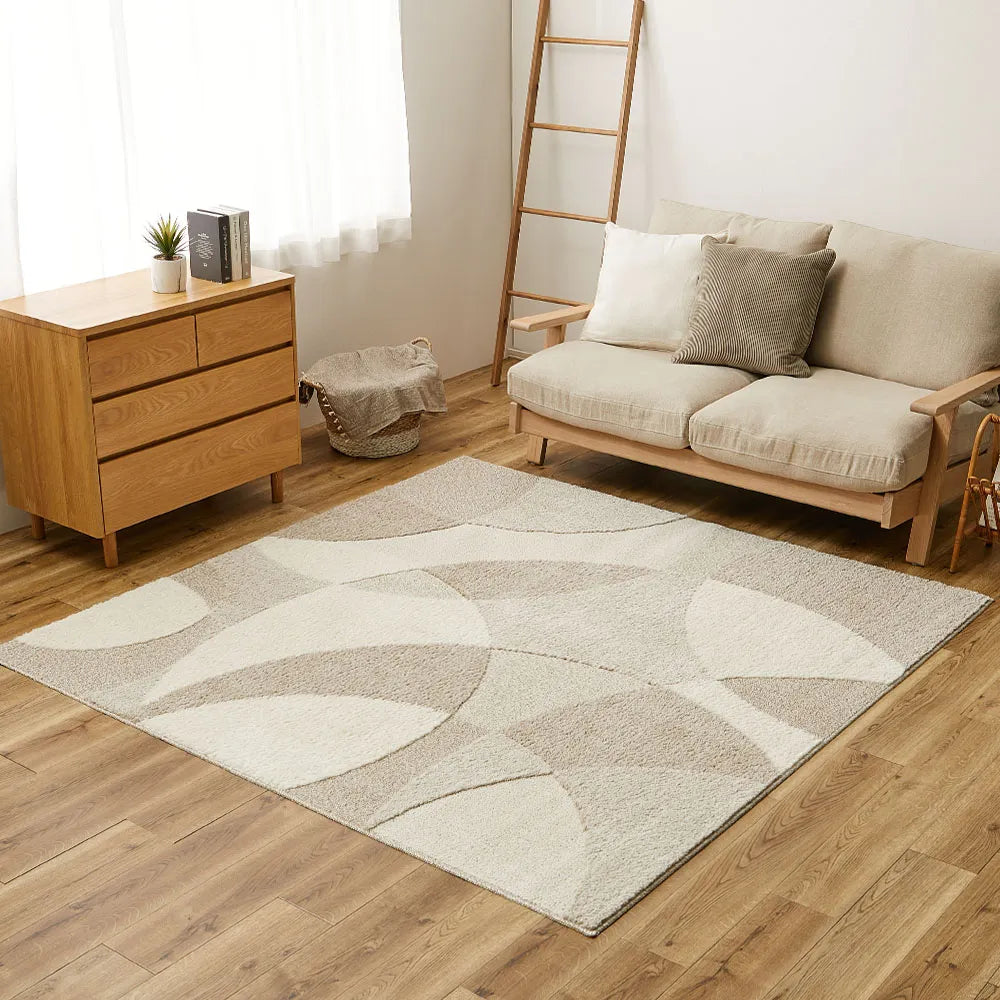 落ち着いた色合いでインテリアにも合わせやすい、おしゃれなモダンデザイン。ふわふわなカットパイルと、さらっとした肌触りのループパイル、異なるパイルを組み合わせることでデザインに立体感が出せ、部分ごとに違うタッチ感が楽しめます。毛足が短くお手入れしやすのもうれしいポイント。裏面は不織布貼りで床を傷つけにくく、ホットカーペット・床暖房対応で、オールシーズンお使いいただけます。