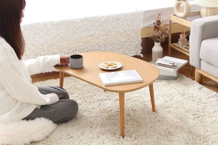 全体的に優しげな丸みを帯びた木製ローテーブル。