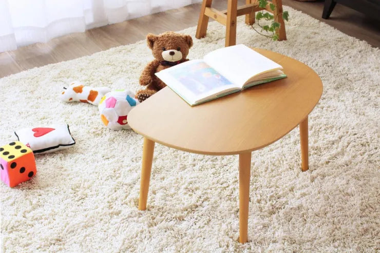 全体的に優しげな丸みを帯びた木製ローテーブル。
