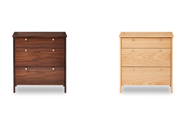 「収納スペースは欲しいけど、見た目にもこだわりたい。」「自分の大事なアイテムをお店のように見せながら保管したい。」そんな声をもとに、作った商品です。小ぶりで可愛らしいデザインですが、使っているパーツは高品質なものを多く採用しています。脚には無垢材を、取っ手には真鍮を用いています。アクセサリーや時計、眼鏡などを収納できるスペースを設けたコレクションタイプと、チェストタイプをご用意しています。