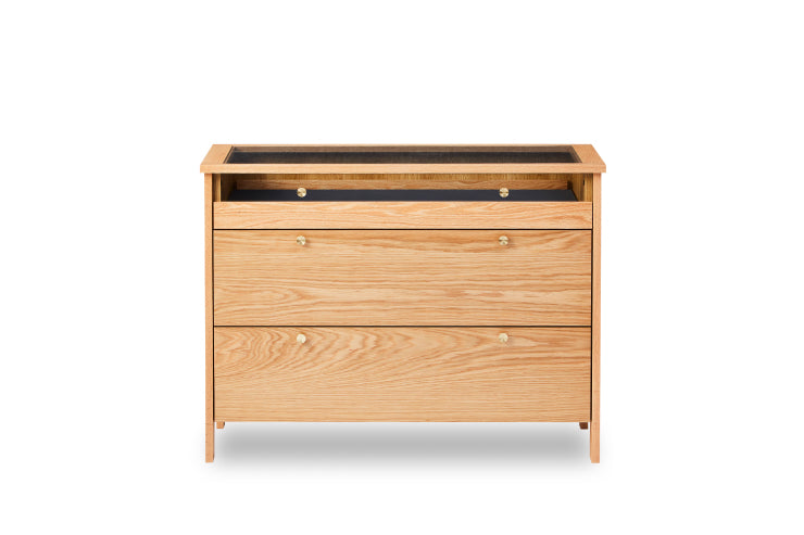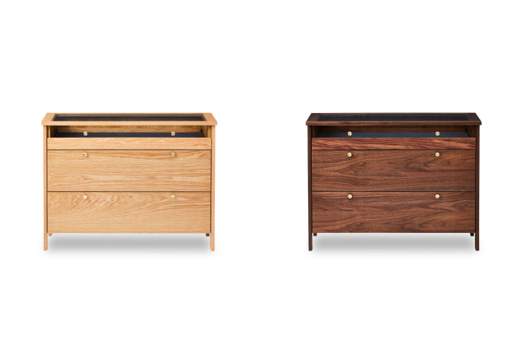 「収納スペースは欲しいけど、見た目にもこだわりたい。」「自分の大事なアイテムをお店のように見せながら保管したい。」そんな声をもとに、作った商品です。小ぶりで可愛らしいデザインですが、使っているパーツは高品質なものを多く採用しています。脚には無垢材を、取っ手には真鍮を用いています。アクセサリーや時計、眼鏡などを収納できるスペースを設けたコレクションタイプと、チェストタイプをご用意しています。