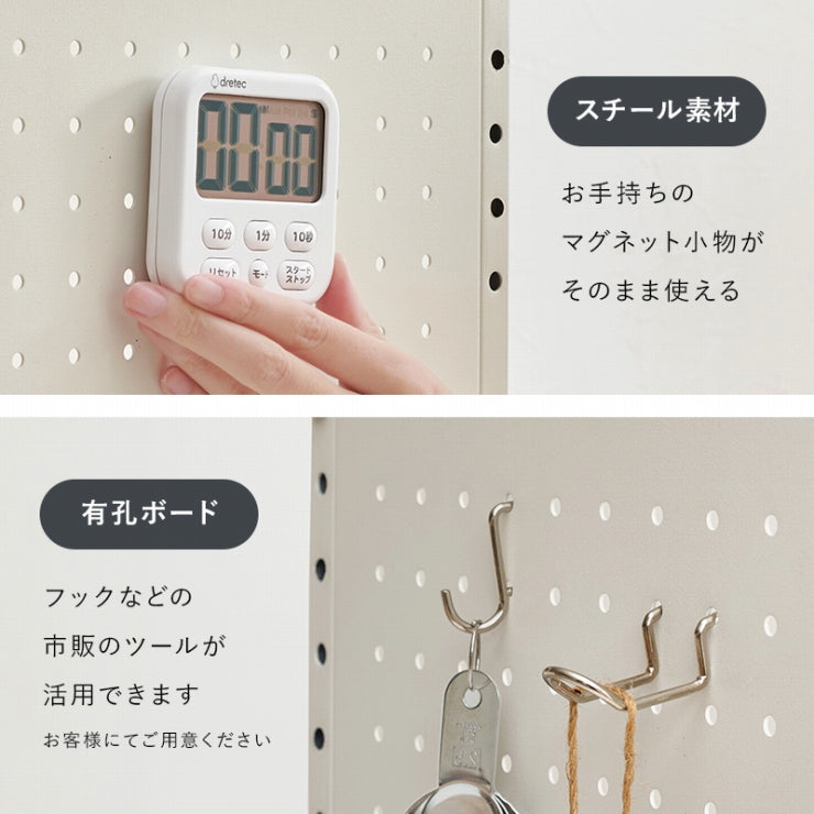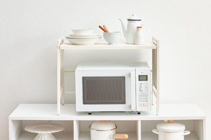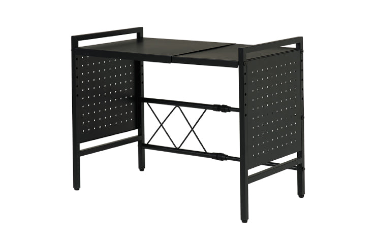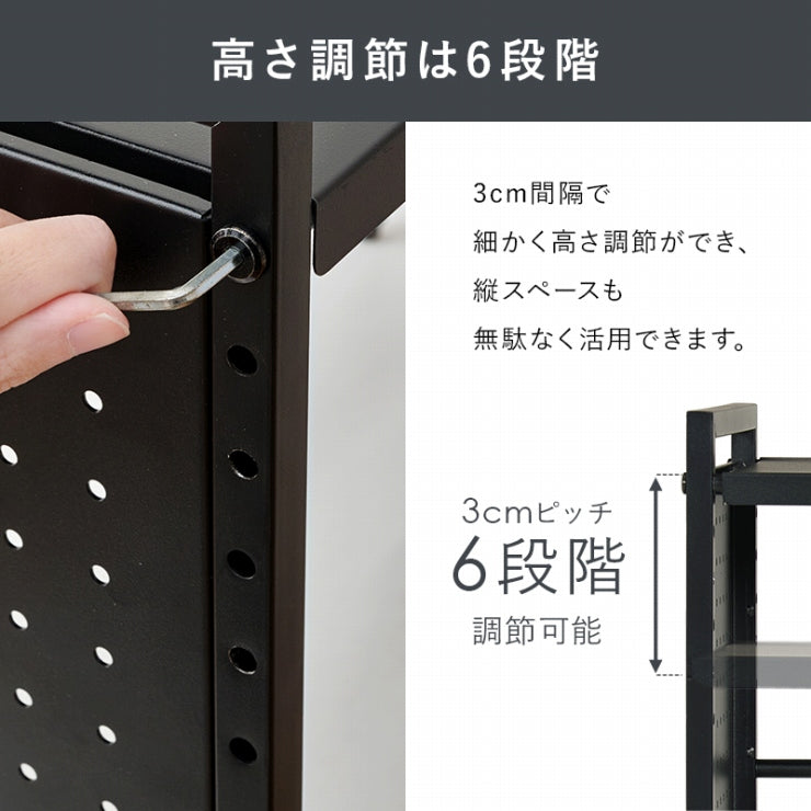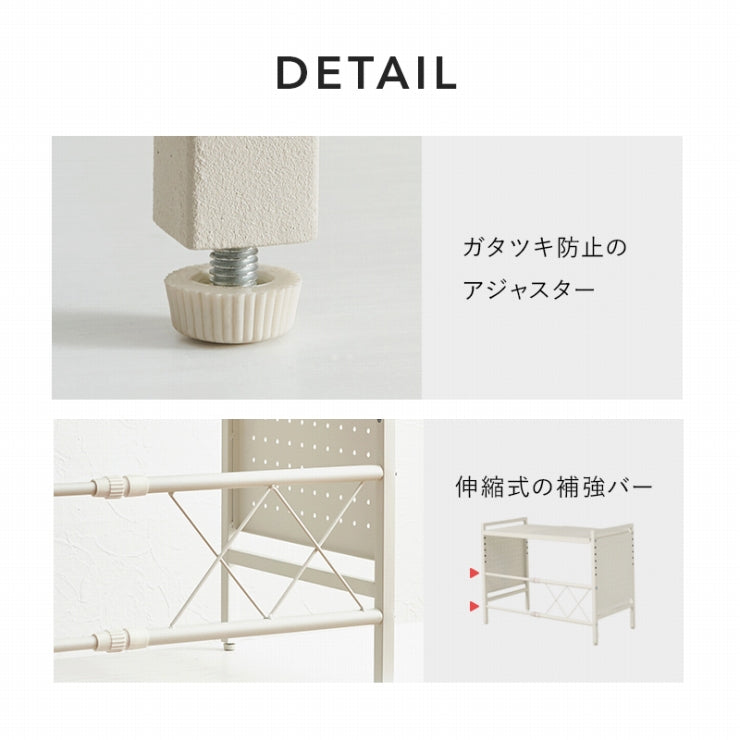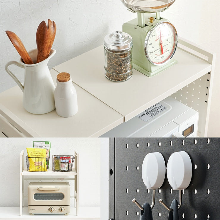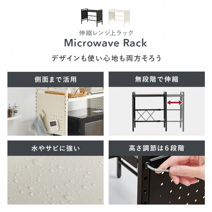 お手持ちの電子レンジや家電に合わせて幅や棚の高さを調節できる伸縮ラック。側面はスチール製の有効ボードなので磁石やフックが使えます。