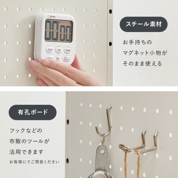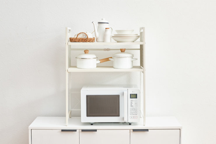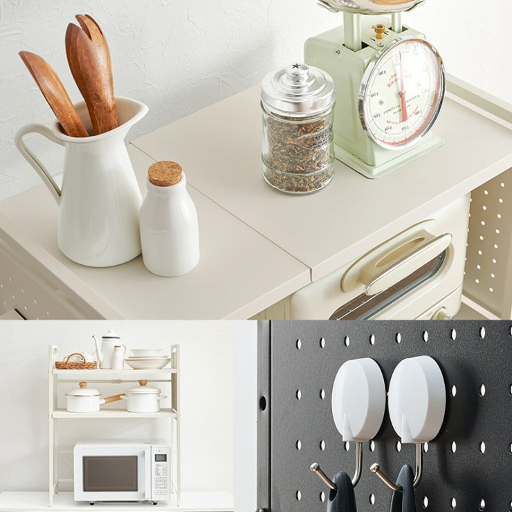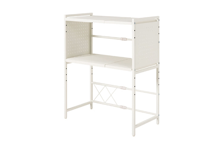 お手持ちの電子レンジや家電に合わせて幅や棚の高さを調節できる伸縮ラック。側面はスチール製の有効ボードなので磁石やフックが使えます。
