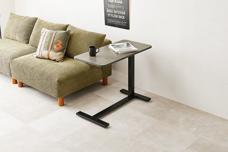 ガス圧式で無段階に高さ調節ができる昇降テーブル。キャスター付きで移動がしやすく、ソファやベッドに座って作業するときも脚が邪魔にならないデザインです。
