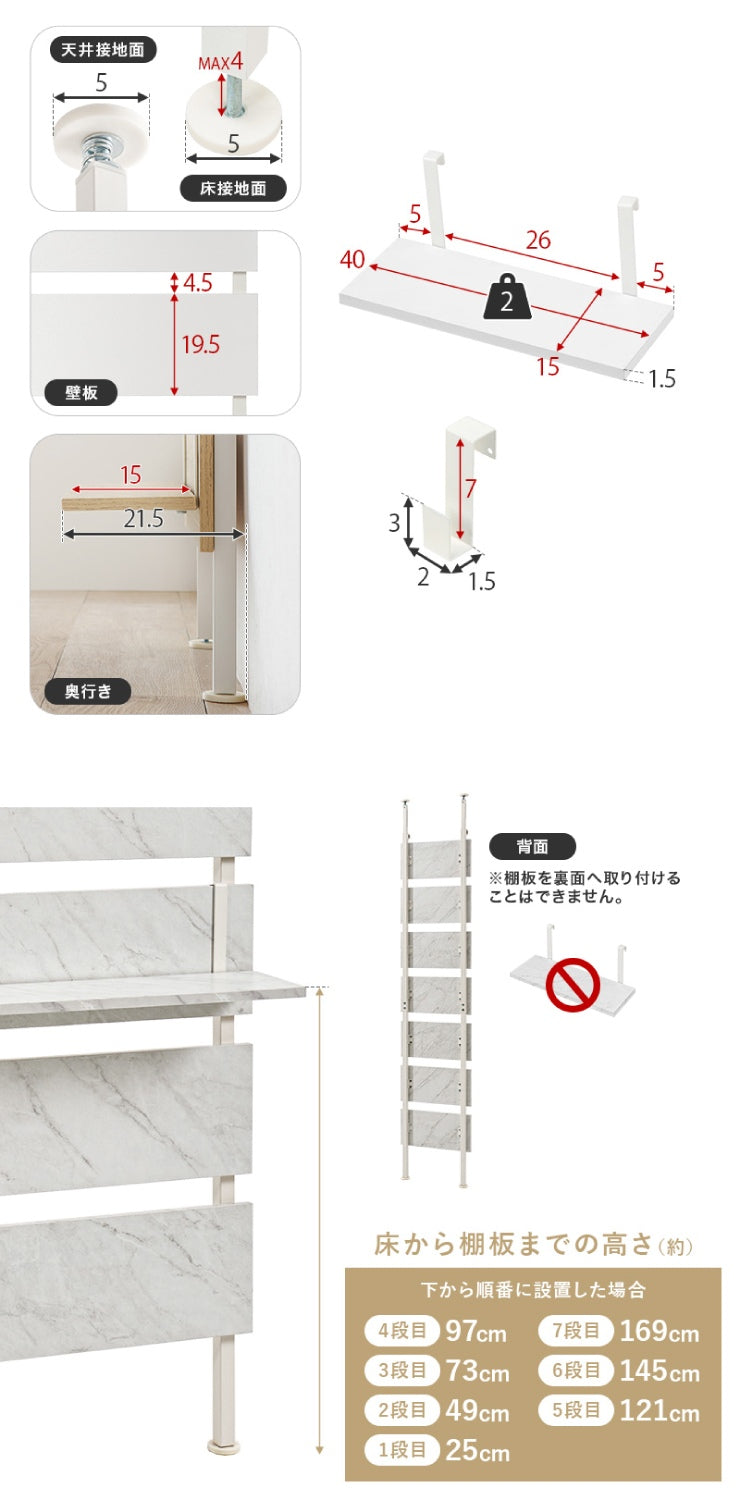 突っ張りウォールラック 7段 棚板2枚付き KTR-3146 幅40cm 奥行21.5cm 高さ200~265cm 高さ調節 ラック おしゃれ スリム 壁面収納 オープンラック ウォールシェルフ 突っ張り 棚 パーテーション 薄型 壁面 収納棚 収納ラック