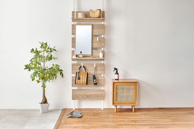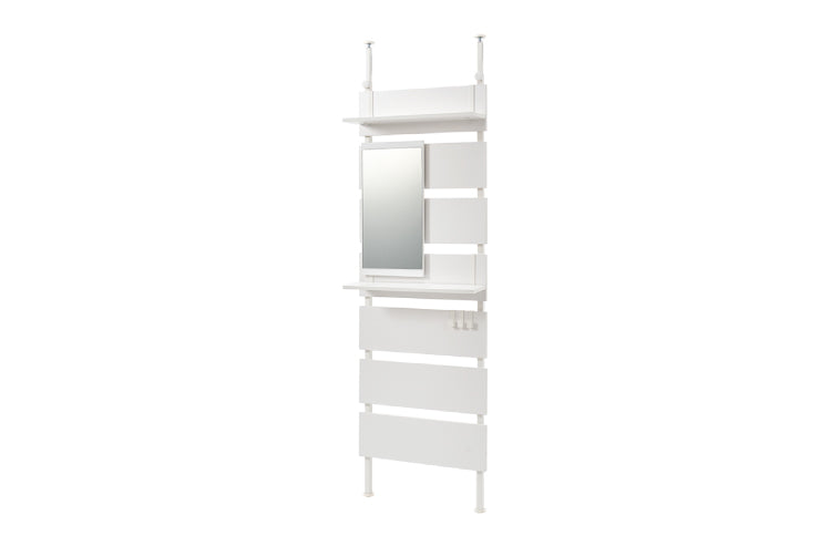 お部屋のいろいろな場所に設置できる突っ張り式ラック。ミラーパーツ付きで、玄関で身だしなみのチェックや寝室でドレッサー替わりになど壁面をおしゃれに使えます。