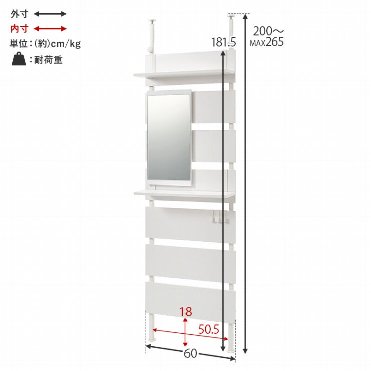 ミラー付き 突っ張りラック KTR-3217 幅60cm 奥行き21.5cm 高さ200~265cm