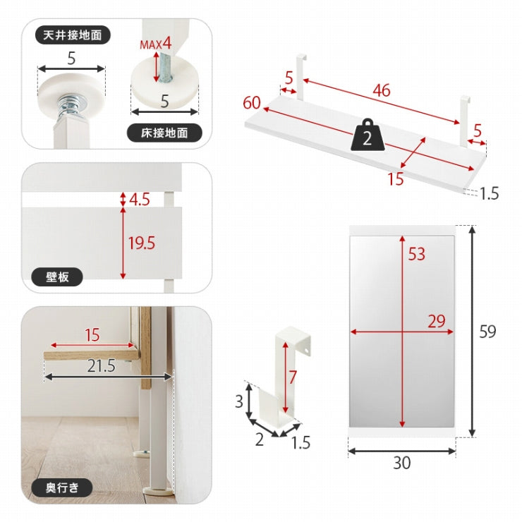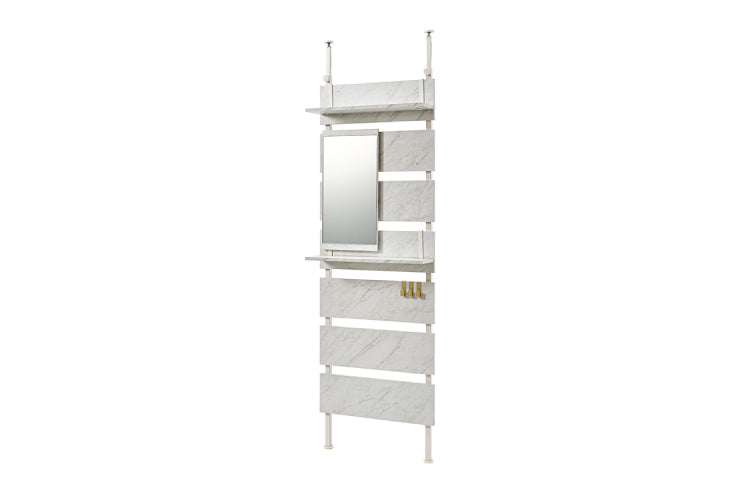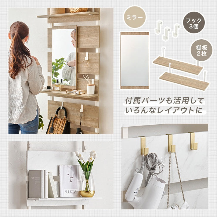 突っ張りラック KTR-3217 幅60cm 奥行き21.5cm 高さ200~265cm ミラー付き 突っ張り棒 ラック 収納棚 壁面収納 ホワイト ナチュラル フック付き 穴あけ不要 玄関 寝室 ドレッサー 省スペース ディスプレイラック 家具 工具不要 木目調 大理石調 おしゃれ 韓国インテリア 北欧