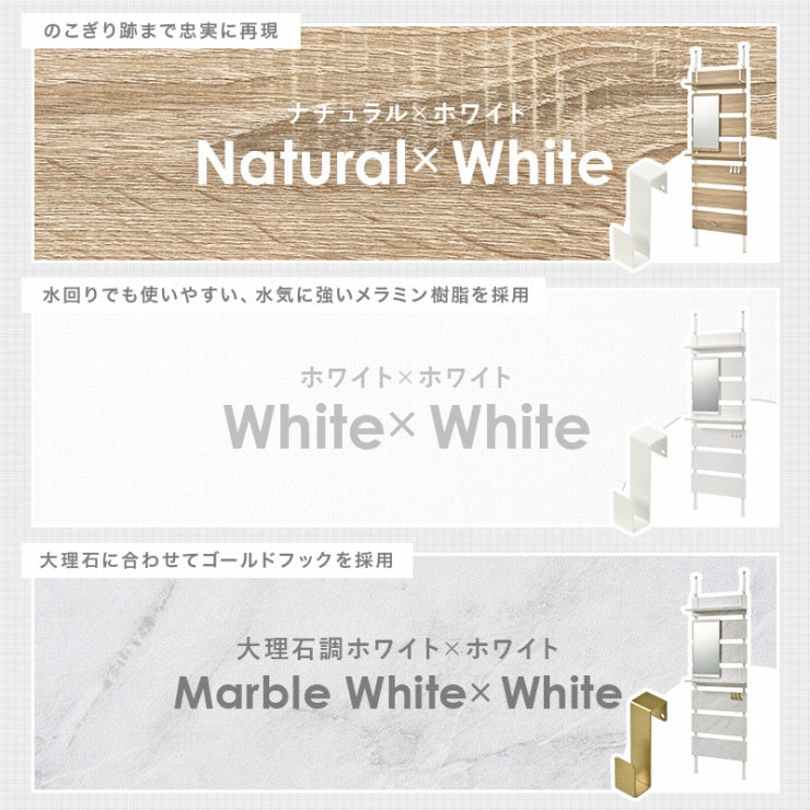 棚板:プリント紙化粧繊維板(マーブルホワイト×ホワイト・ナチュラル×ホワイト)・メラミン樹脂化粧繊維板(ホワイト×ホワイト)