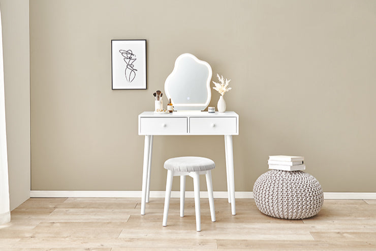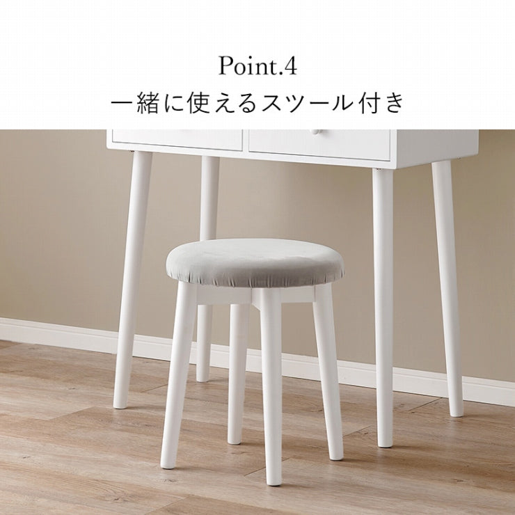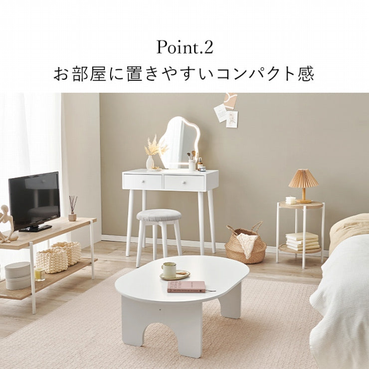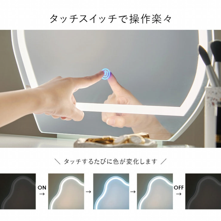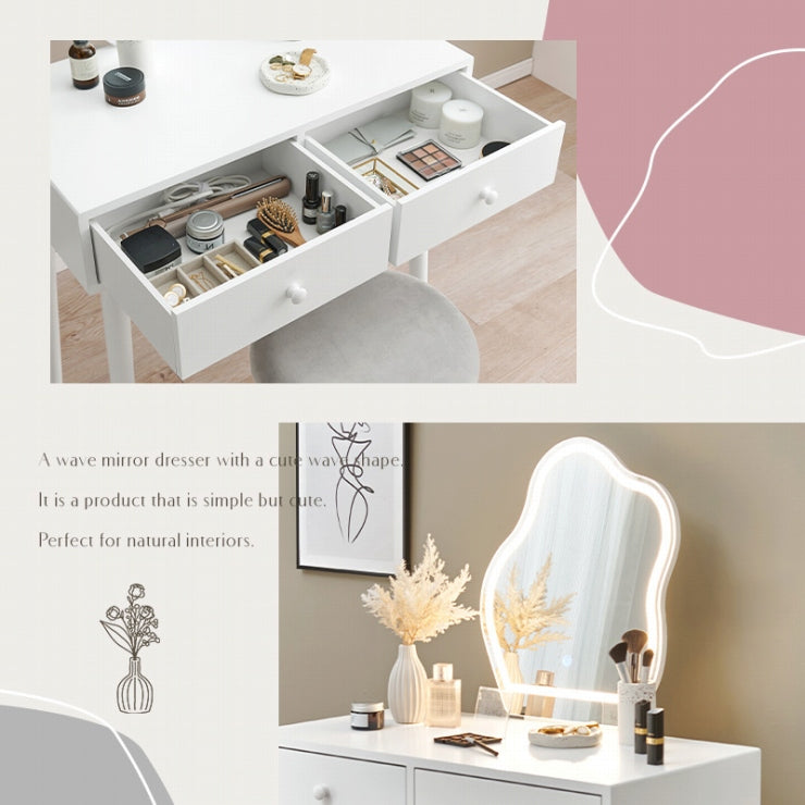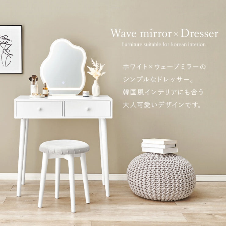 LEDの女優ライト付きのドレッサー。ホワイトのシンプルな本体に特徴的なウェーブミラーを合わせた大人可愛いデザインが魅力的。たっぷり収納ができて、一緒に使えるスツール付と使い勝手も優れています。
