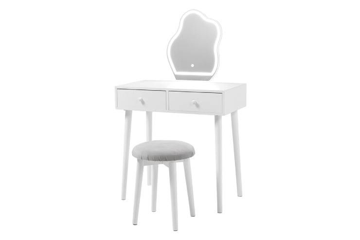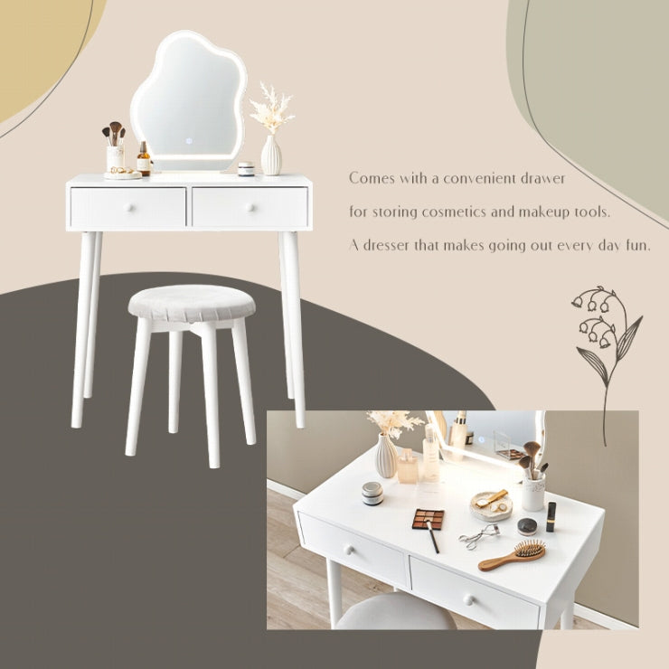 ドレッサー MD-6738 幅75cm 奥行き48cm 高さ123.5cm LEDライト付き 鏡台 メイクスペース デスク スツール付き 作業台 女優ライト 化粧品 スキンケア用品 アクセサリー ヘアアイロン 小物収納 ホワイト ウェーブミラー コンパクト おしゃれ かわいい 韓国インテリア 北欧
