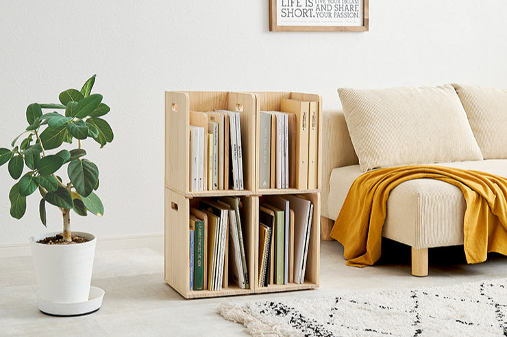 仕切りが付いて本・雑誌をしっかり収納。重ねて使えます。天然木パイン材を使用しており、無塗装なので経年変化を楽しんだりDIYでアレンジしたりできます。