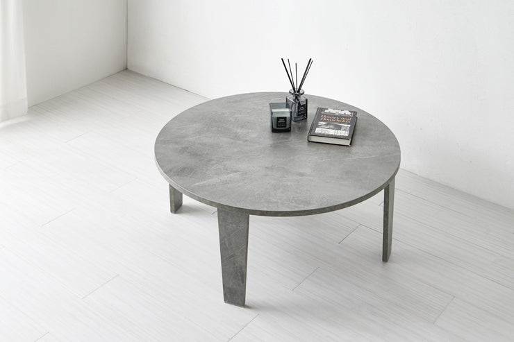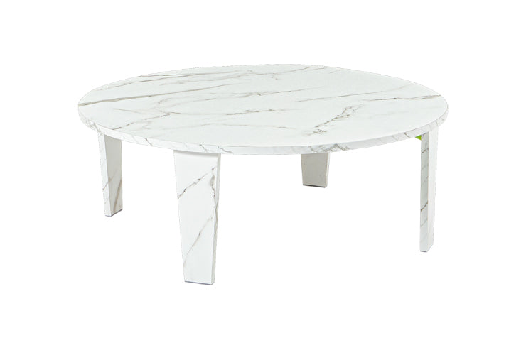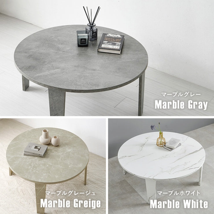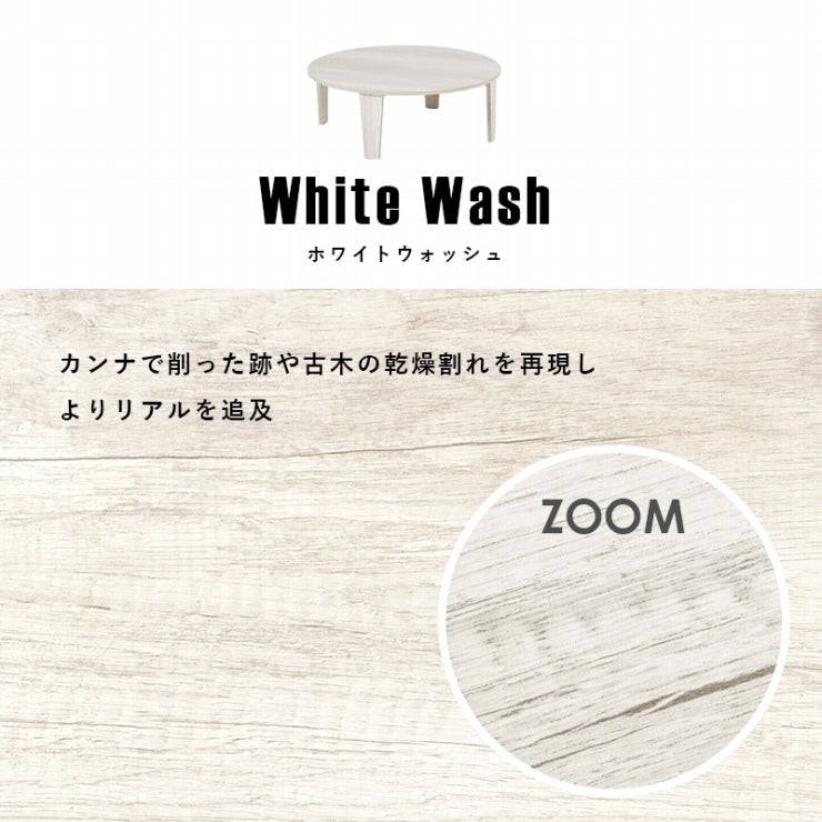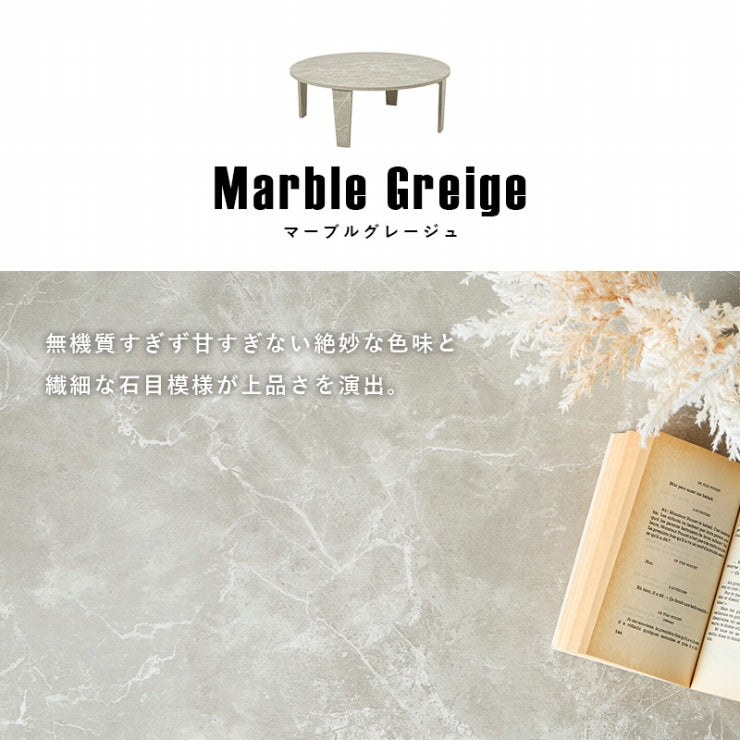 風合いの再現にこだわった円形テーブル。ヴィンテージの味わいがある木目調とモダンな印象の石目調から選べます。折りたたみ機能付き。