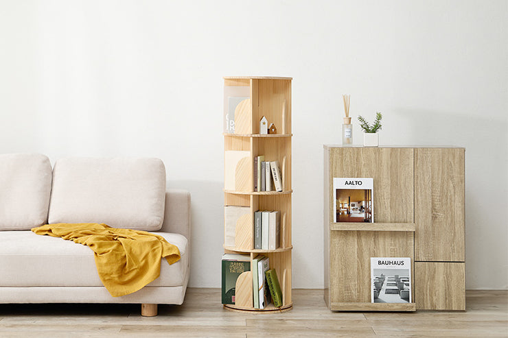 360度回転するので本が探しやすく、省スペースなのに大容量な本棚。天然木パイン材を使用しており、無塗装なので経年変化を楽しんだりDIYでアレンジしたりできます。