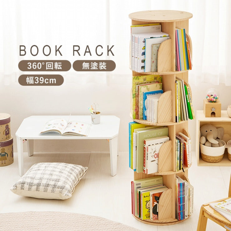 丸回転ラック MUD-6428 幅39cm 奥行き39cm 高さ128cm ブックラック 360°回転 無塗装 本棚 オープンラック コミックラック 収納棚 収納ラック 天然木 省スペース 簡単組立 DIY 子ども部屋