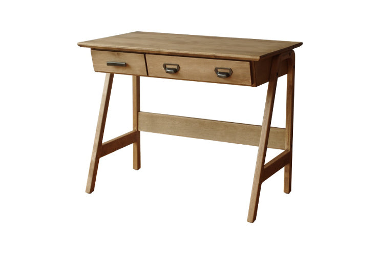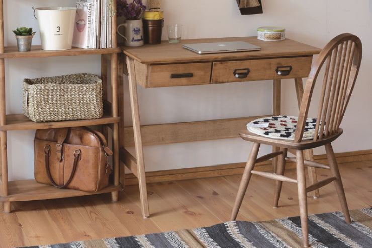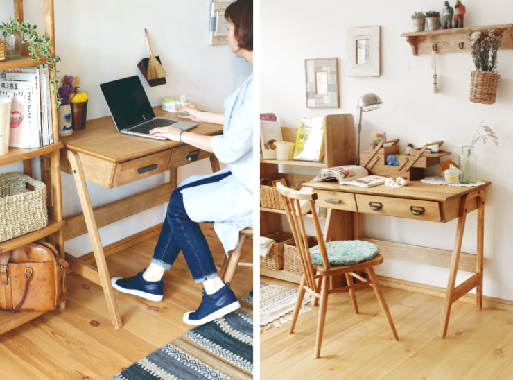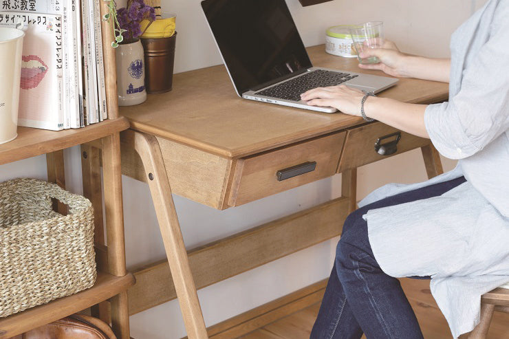 木の優しい風合いを大事にしたデスク。お子様の学習デスクから、大人の在宅デスクとして使えるスタイリッシュで使い勝手の良いアイテムです。取っ手のパーツが特徴的で、他にはない雰囲気です。
