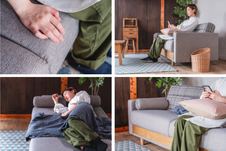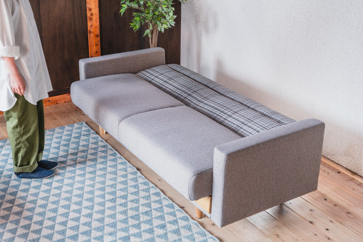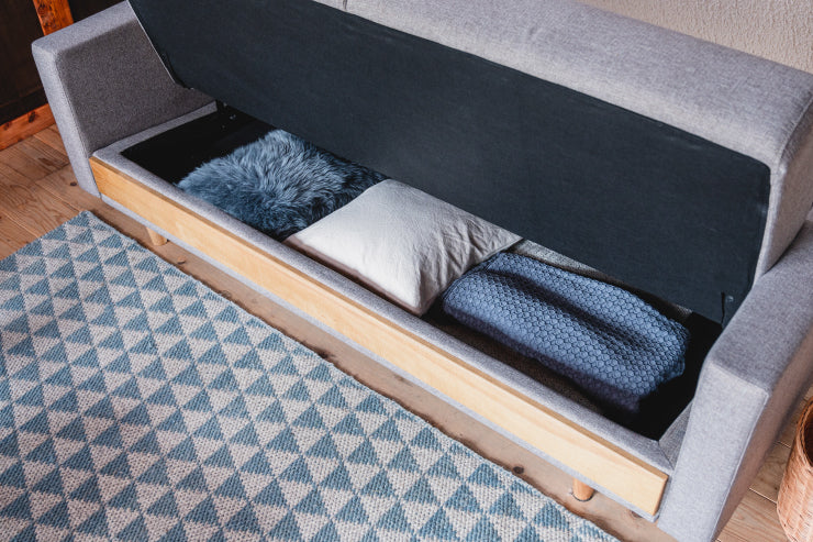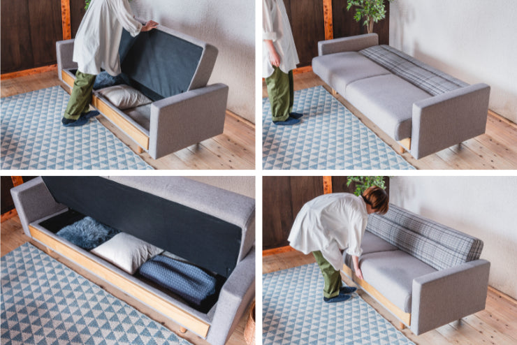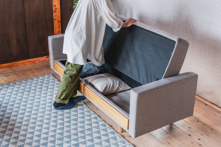 3つの仕様ができるソファベッド。ソファとしてはもちろん、ベッドとしても楽しめます。そして、枕やひざ掛けなどを収納できる座面下収納スペースもあります。座面を持ち上げるだけで女性一人でも簡単に仕様を変更できます。
