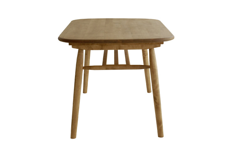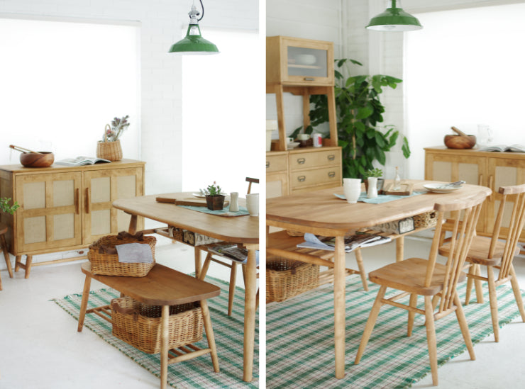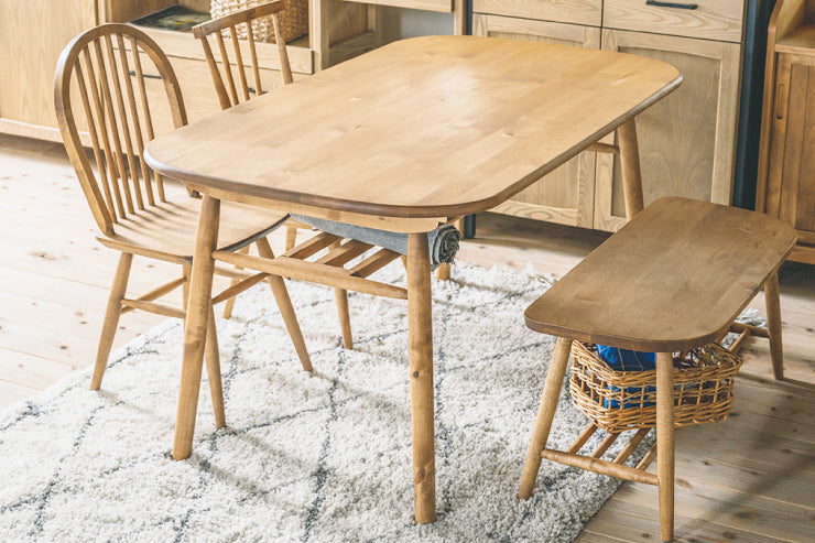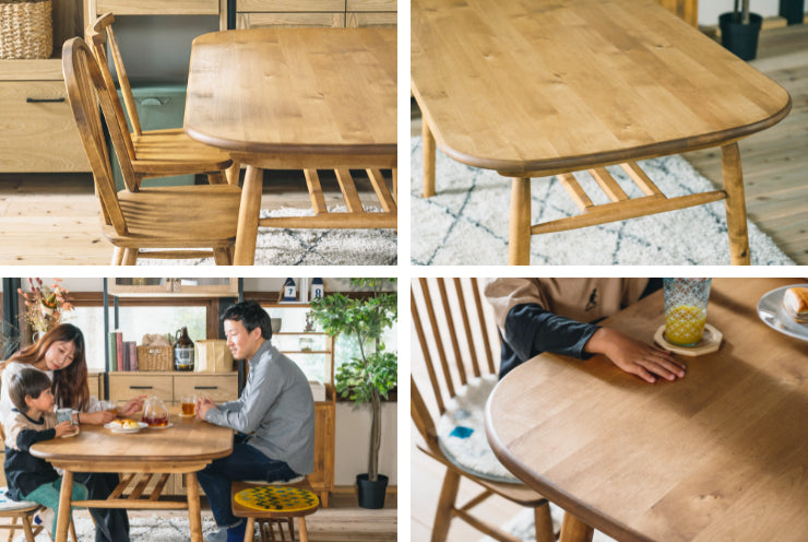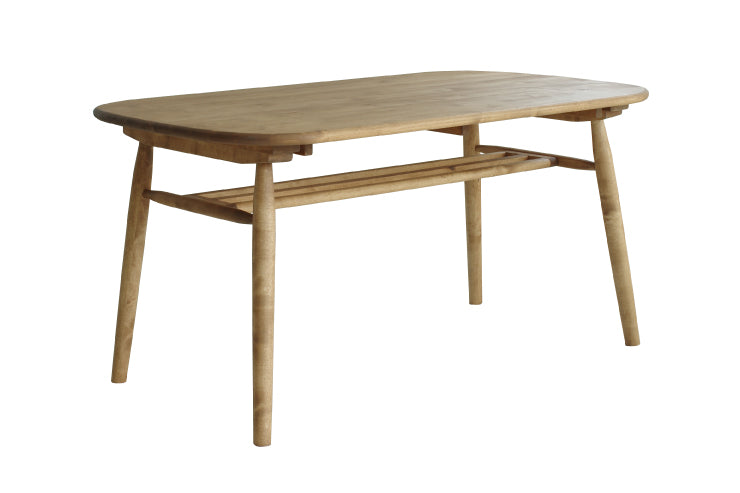 表に見えない収納で、いつもテーブルを楽しく。天板下に棚のついたダイニングテーブル。机の上の雑誌や新聞をさっと仕舞えます。角が丸みを帯びており、角あたりの心配がない、やさしいデザインです。
