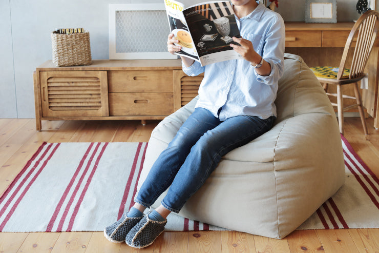 しっかりとした座り心地のビーズクッション「ウォーカー」。座面と背面が一続きになっており、形が決まっていないので、低めにゆったり座るのも良し、高めにしっかり座るのも良し。自分の好みに合わせて座面高が変わってくれます。持ち手もあって運びやすく、見た目もかわいくておしゃれです。