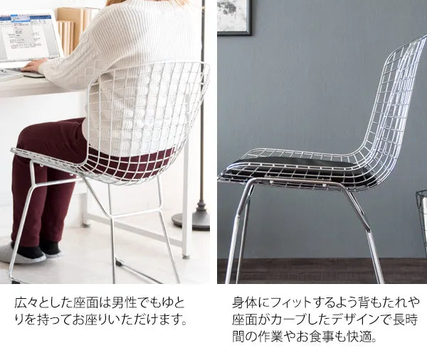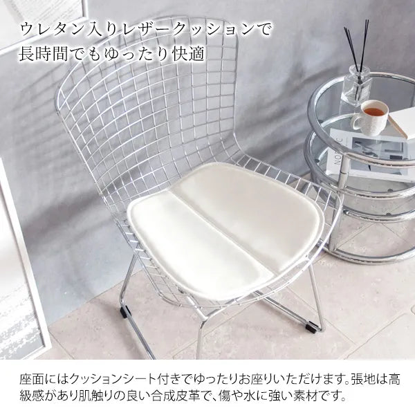 スチールのワイヤーが網目状に構成された背もたれは軽量かつ耐久性に優れております。広々とした座面はレザークッション付きでお尻が痛くなりにくく、くつろげるデザインです。