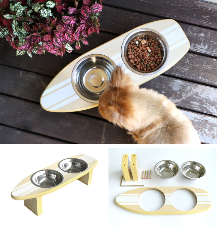 サーファーの飼い主さんには堪らない!サーフボード型のエサ皿が新登場。裏には滑り止めが付いており、元気なワンちゃんでもズレる心配がないので安心。お皿はステンレスで衛生的。台の高さが約12cmとハイタイプなので、小型~中型のワンちゃんやネコちゃんにおすすめ!