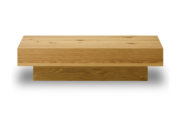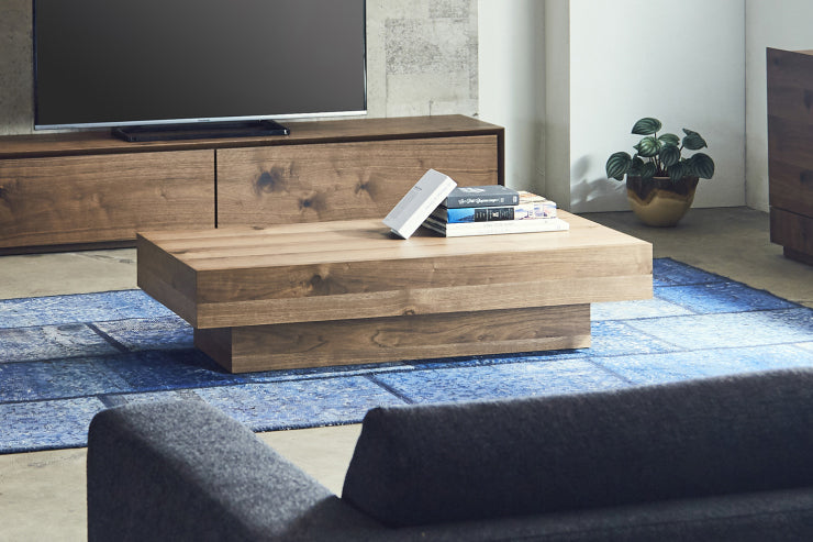 匠の技術と、削ぎ落したデザインのテーブル。箱物産地「大川」で屈指の技術を用いて生産されたシリーズです。節有突板の木目を通し、無垢以上の存在感を出しています。本体の構造には、留めの技術を用いて、突板を手作業で立体的に貼り込んでいます。部屋の美観を損ねないように計算された高さになっています。