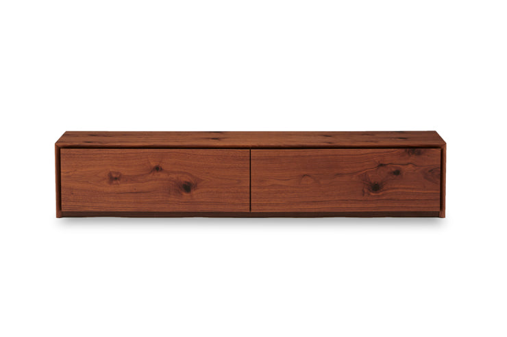 匠の技術と、エッジが効いたボード。箱物産地「大川」で屈指の技術を用いて生産されたシリーズです。節有突板の木目を通し、無垢以上の存在感を出しています。本体の構造には、留めの技術を用いて、突板を手作業で立体的に貼り込んでいます。前板には突板ガラスを用いて、繋がった美しい木目でありながら、扉を開けずともリモコンを使用できる使い勝手の良さも持ち合わせています。