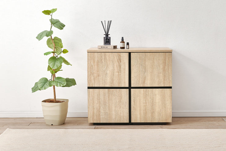 木目調デザインのシンプルなキャビネットで、生活感の出るものをひとまとめに収納できます。
