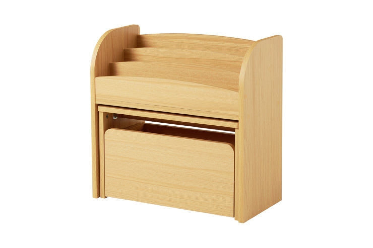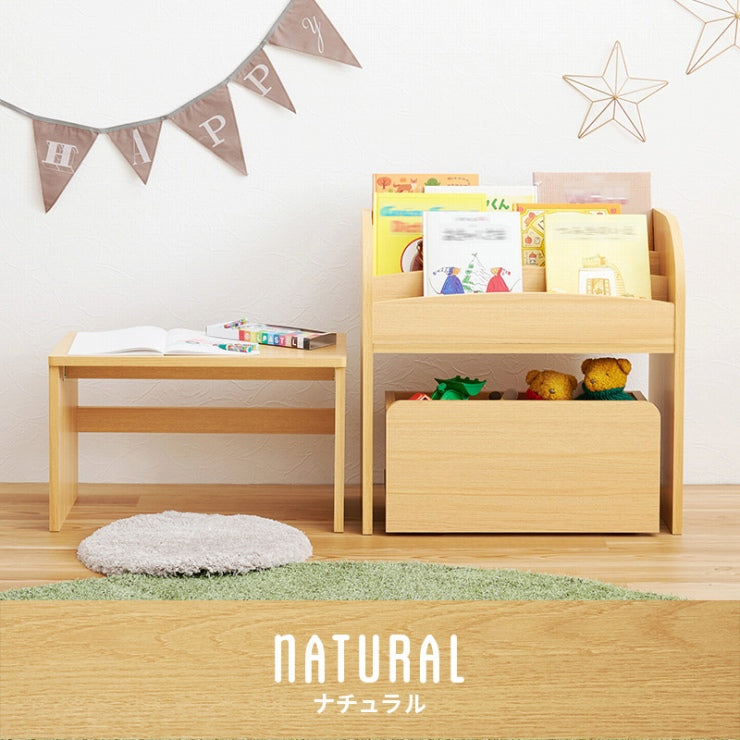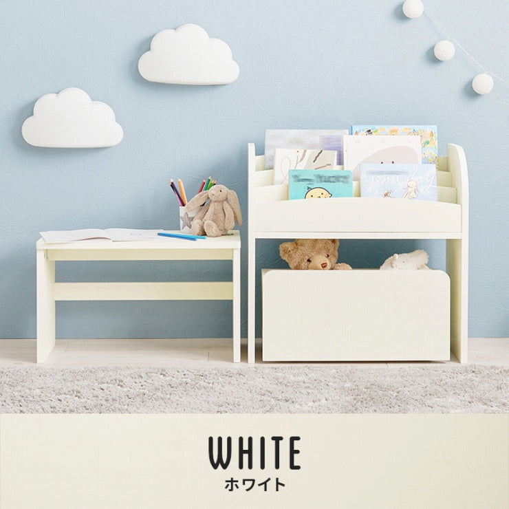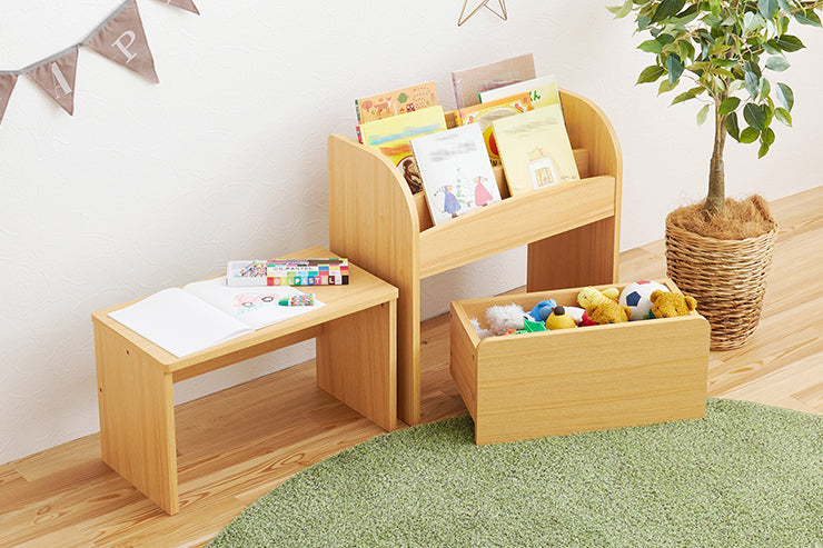 表紙が見やすくオープンタイプなので出し入れしやすい絵本・マガジンラック。コンパクトにまとまるミニデスクと収納に便利なワゴンが付いた3点セット。