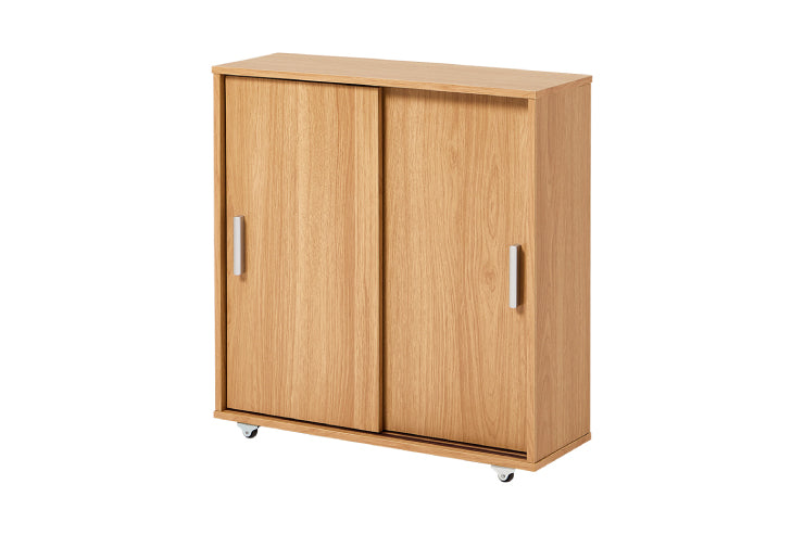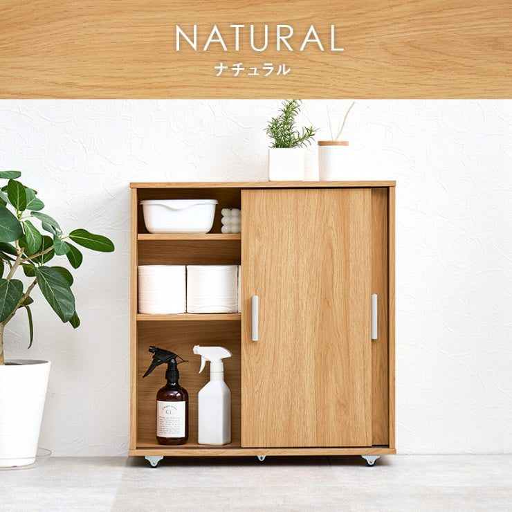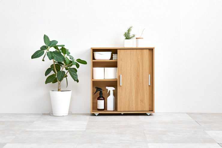 引き戸タイプなので省スペース。大きめのペーパーロールも入る収納棚は高さを変えてアレンジ可能。お掃除しやすいキャスター付き。