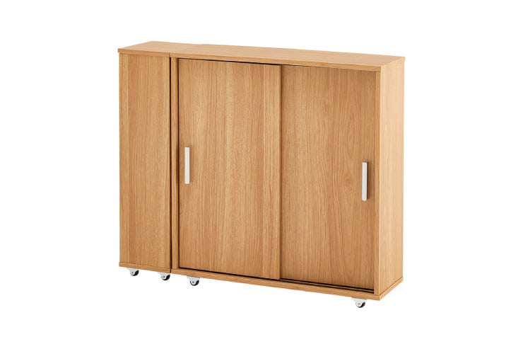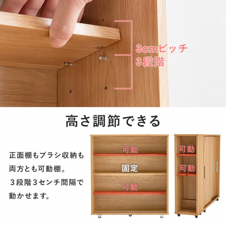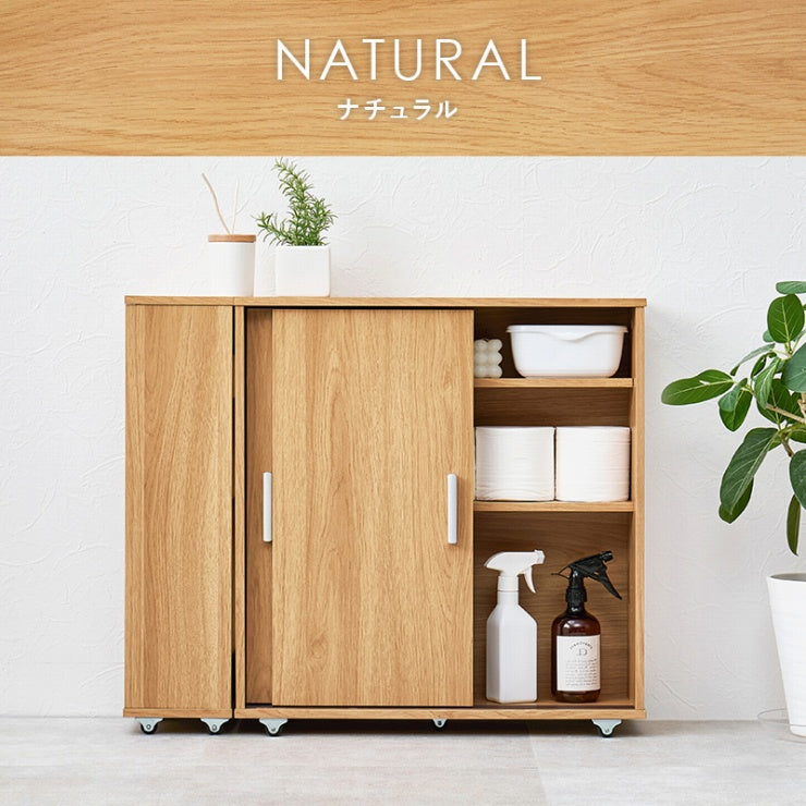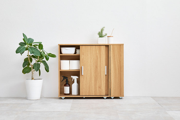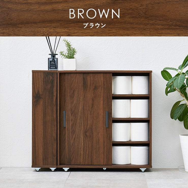 引き戸タイプなので省スペースなのに、大きめのペーパーロールも入る収納力。お掃除ブラシが収納できるサイドラックとキャスター付き。