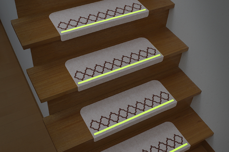 滑りやすいお家の階段に、階段マットを敷くことでクッション性も高く、滑り止めにもなります。また、蛍光染料で黄色い線をプリントしているので、夜の暗い階段でも足元が見やすく安全です。
