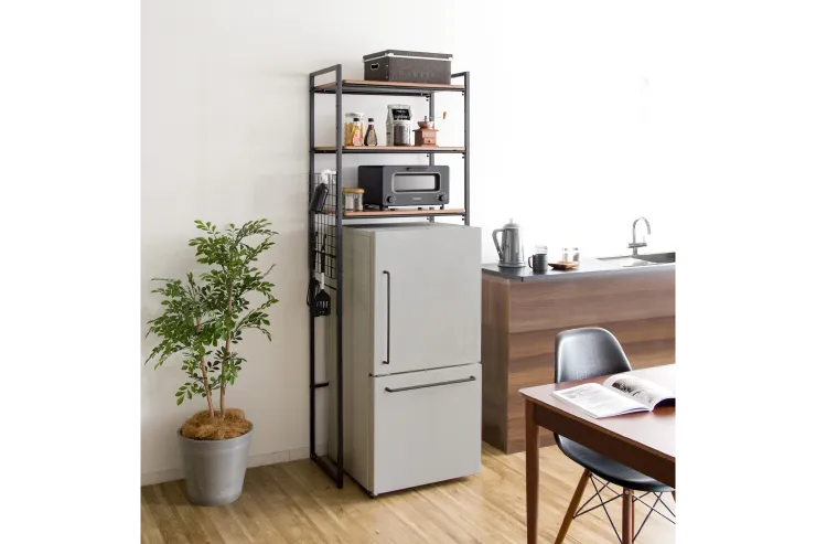 冷蔵庫上や洗濯機上の空いたスペースを有効活用できるマルチラック『Rizo(リソ)』。安定感のある棚板は電子レンジやトースターも置けます。