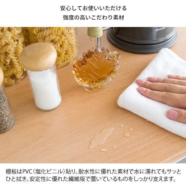 横幅66.5~90cmの伸縮タイプでお家の冷蔵庫や洗濯機に合わせて設置が可能です。三段の可動棚でたっぷり収納。サイドはちょい掛けに便利なサイドネットとS字フック2個付き。