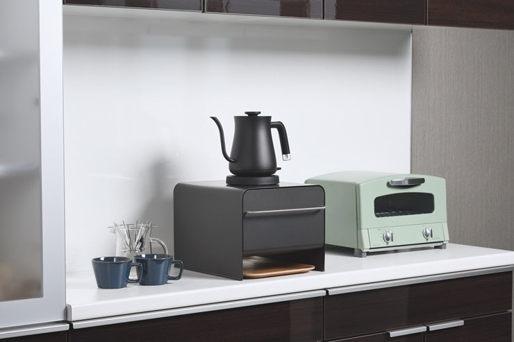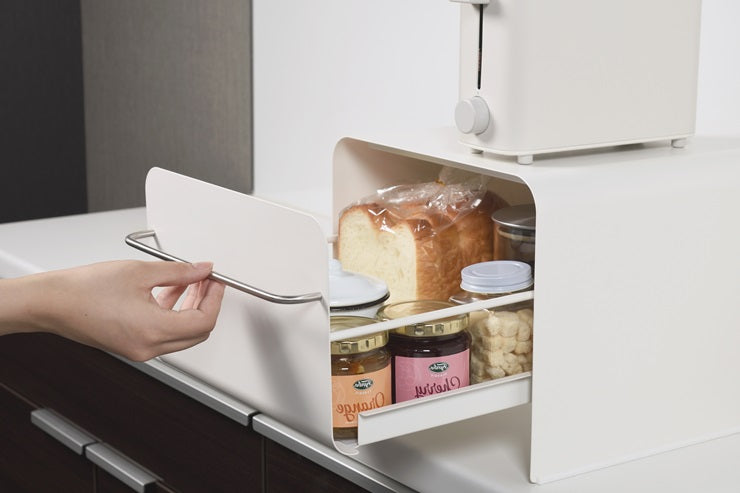 使いやすい引出しタイプのブレッドケース。パンや調味料、コーヒー豆などをまとめて収納でき、ローラー付きのレール引出し式のため、スムーズに収納部奥までしっかり確認できるのが魅力です。