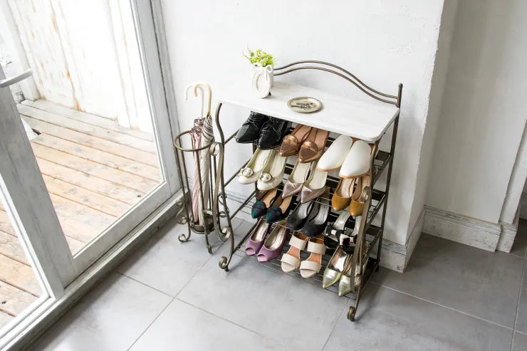 曲線をあしらった装飾の洗練されたデザイン、心地よさを醸し出すアンティークゴールドが人気の『Celestia(セレスティア)』シリーズのシューズラック。