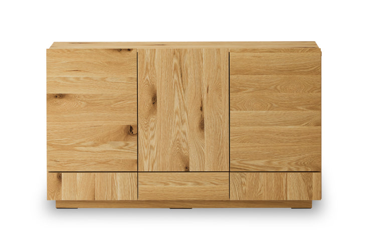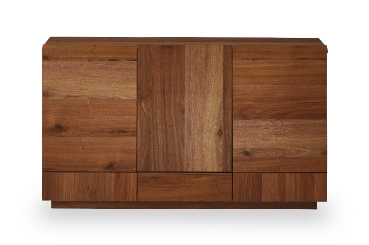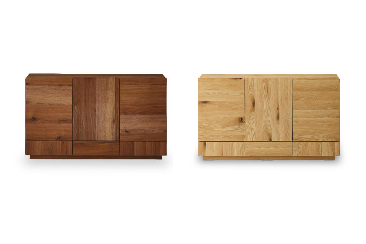 サイドボードという品群は、「収納家具」という目的もさることながら、家具として最も飾る要素の強い種類です。トビは、節が入った突板を用いており、表面に天然木の質感を強く出しています。キャラクター性が強くなる半面、扱いにくい素材ですが、職人の目利きで一点ずつ表情を創り出しています。