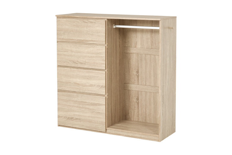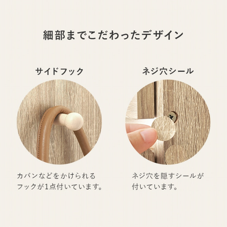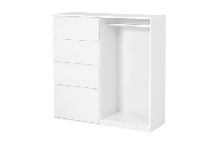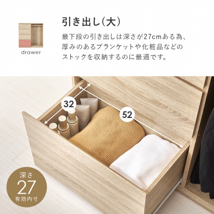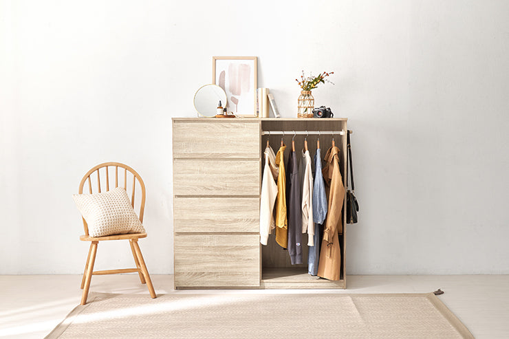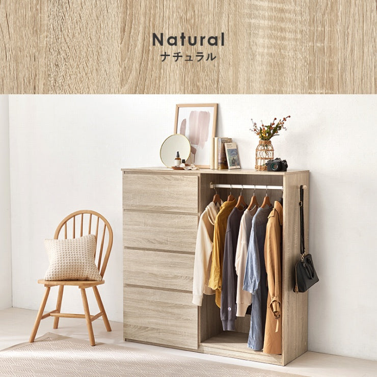 大きな引出しとハンガーポールが付いていて、これ1台で大量の服や小物をまとめて収納可能。フラットなお部屋になじむデザインです。