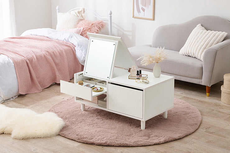 天板を開ければドレッサーとして使えるセンターテーブル。ミラー下のトレー部分を引き出せるので使いやすく、物を置いたまま天板を閉じられます。