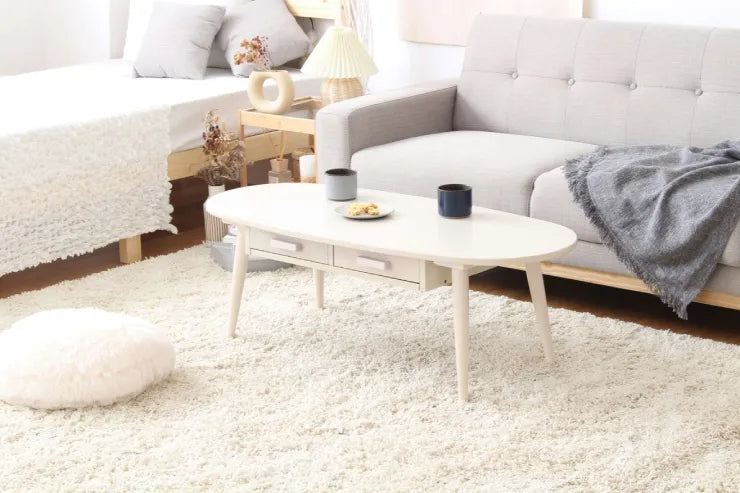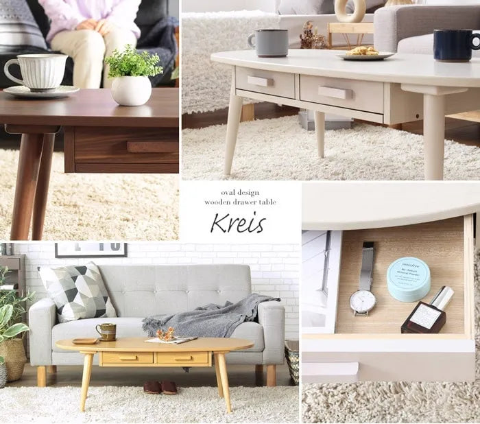 引き出し付きの木製ローテーブル「クライス」は、可愛い楕円形フォルムで温かみのある木の質感を演出。安全面にも配慮されており、小さなお子様がいる家庭でも安心です。天板下の引き出しは前後どちらからでも使え、使い勝手も良好。幅80cmのコンパクトサイズは圧迫感が少なく、1人暮らしや広く見せたい方に最適です。カラーはブラウン、ナチュラル、ホワイトの3色展開で、コーディネートの幅も広がります。