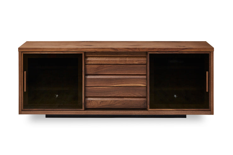 ダークグレーガラスとウォールナットのコントラストを活かしたボードシリーズ。古くから水屋箪笥(今でいう食器棚)を作っている工場で、引き戸を活かした企画を行いました。引き戸の部分は、無垢材のハンドルがアクセントになっており、ダークグレーガラスのシックな色合いにマッチしています。引出しの前板には無垢材を用いており、無垢を彫り込むことで手をかける場所を設けています。高さは台輪、低いスチール脚、高いスチール脚と3つから選ぶことが出来るため、お好みのスタイルあわせてご使用いただけます。