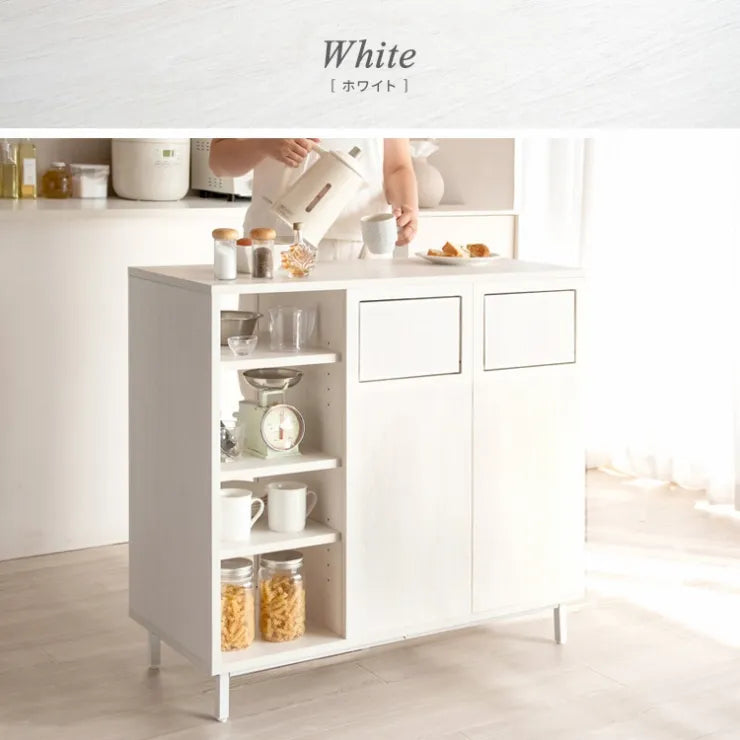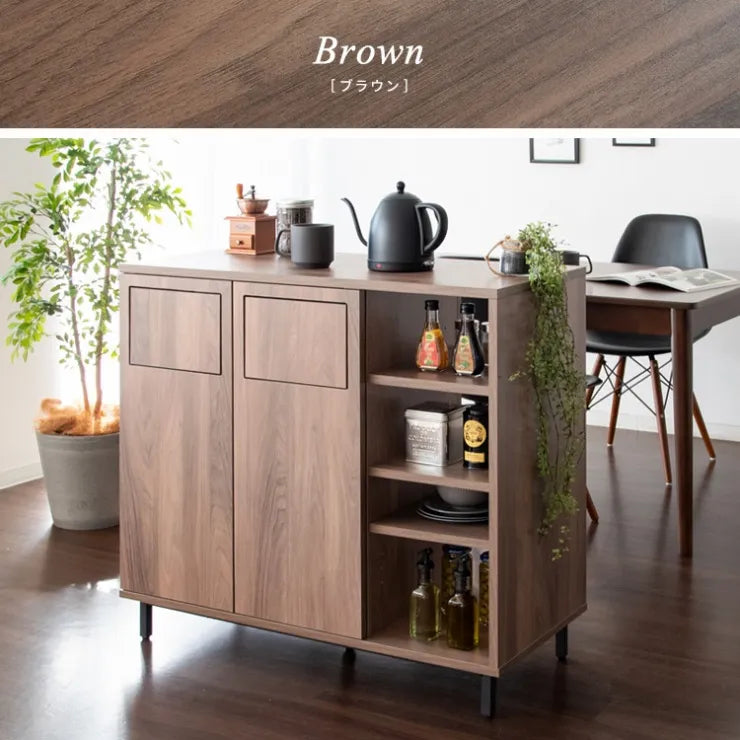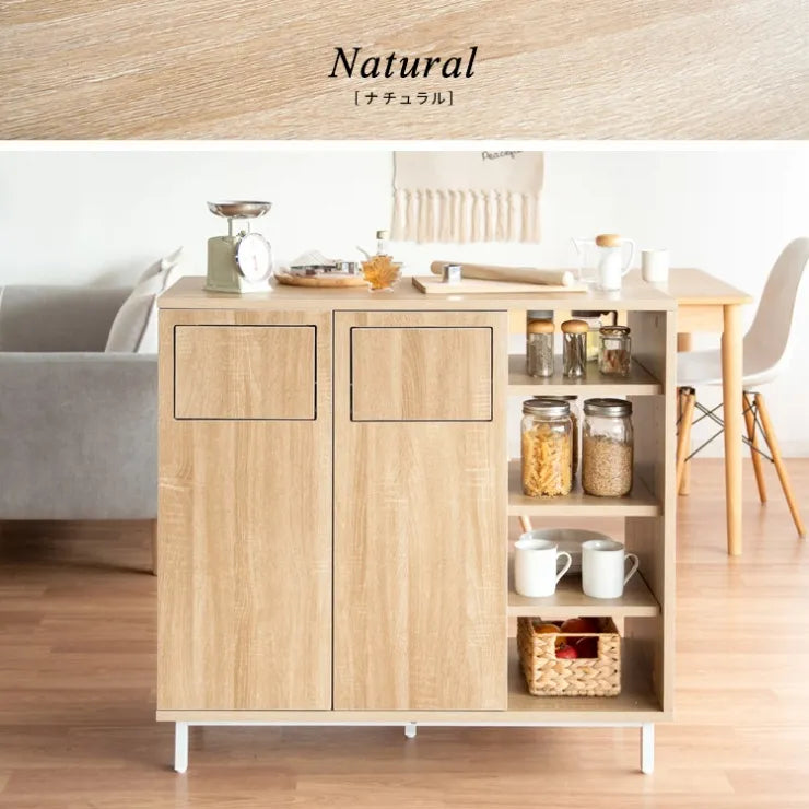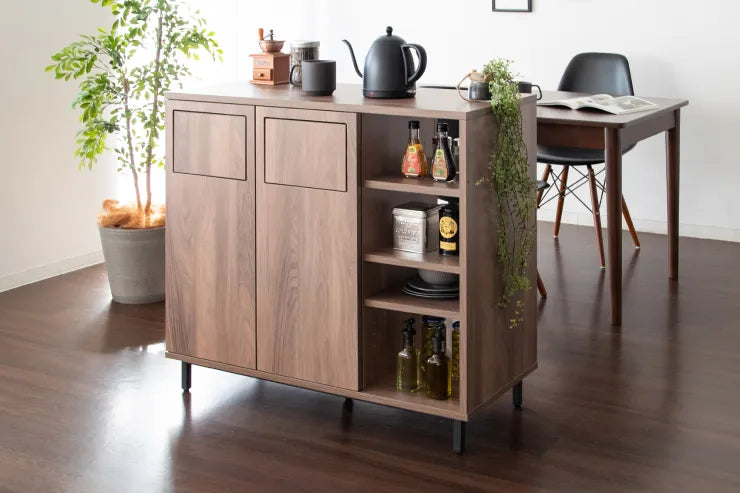 キッチン・ダイニングの両側にプッシュ扉があり、両方からゴミを分別して捨てられます。両側から取り出せる可動棚付きの棚は調味料や調理器具を収納できます。広々とした幅90cmと丁度良い高さ90cmの天板は調理スペースとしてお使いいただけます。リビングやキッチンとの間仕切りとしても便利。
