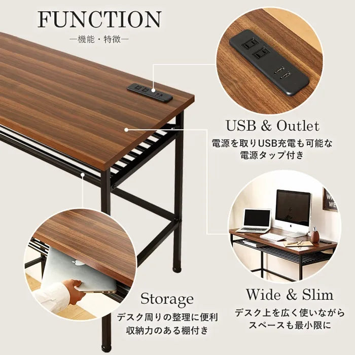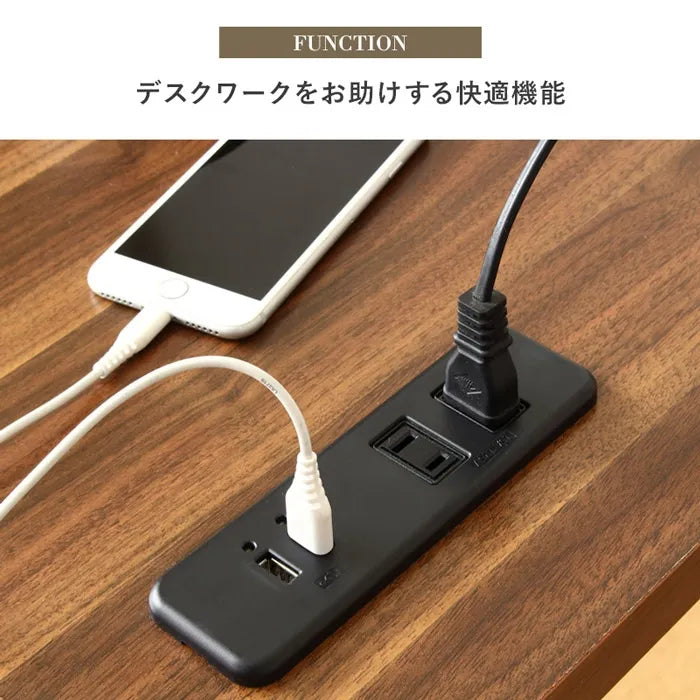 コンセント口とUSBポートを搭載し、手軽に電源を確保。機能的でスタイリッシュなデスクで、毎日を快適に。