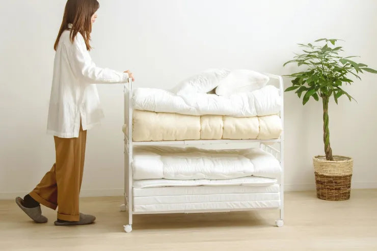 布団もスッキリ、通気性抜群。移動も楽々な調節可能布団収納ラック。