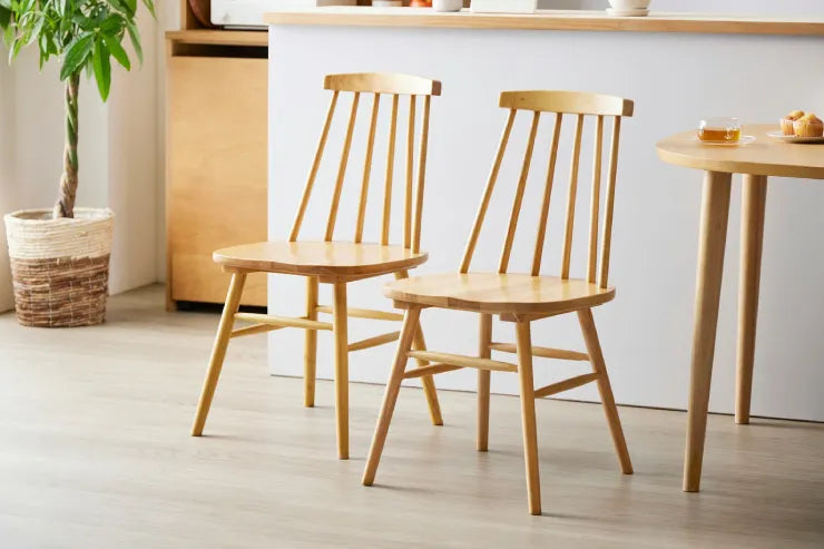 天然木製のウィンザーチェア、英国伝統のデザインを採用。軽やかで丸みを帯びた優しいフォルム、背もたれが体にフィットし、長時間座っても疲れにくい快適な座り心地です。座面は広めで、座ぐりが施されており、体格の大きな男性にも適しています。座面高42cmで、ダイニングテーブルやデスクにぴったり。耐水性ラッカー塗装でお手入れ簡単、足裏フェルト付きで床を傷つけません。耐荷重100kgで高い耐久性を誇ります。
