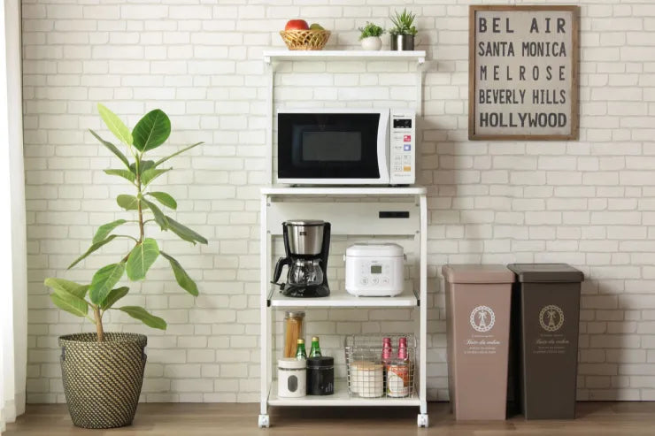 大型レンジも余裕で収納。清潔感と機能性を兼ね備えたホワイトレンジラック。