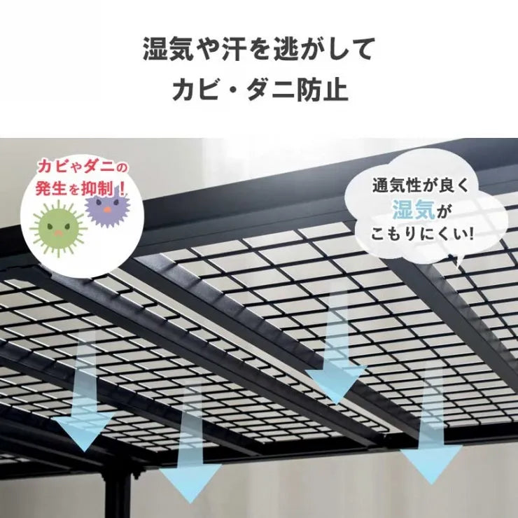 シンプルでお部屋が広く感じるヘッドレスベッド。ベッド下は広々とした 収納スペースになり、お部屋もスッキリ!こだわりの頑丈設計で安心の眠りを お届けします。床面の高さを2段階で調節可能です。マットレスの厚さや、ベッド 下の収納用途に合わせて、お好みの高さにできます。就寝中の発汗による湿気の こもりも、通気性の良いメッシュ床板ならこもりをある程度カビやダニの発生を 抑制します。耐荷重は約200kgと高い安定性を誇ります。大柄な男性でも安心 して使える、しっかりした耐久性の高い構造です。