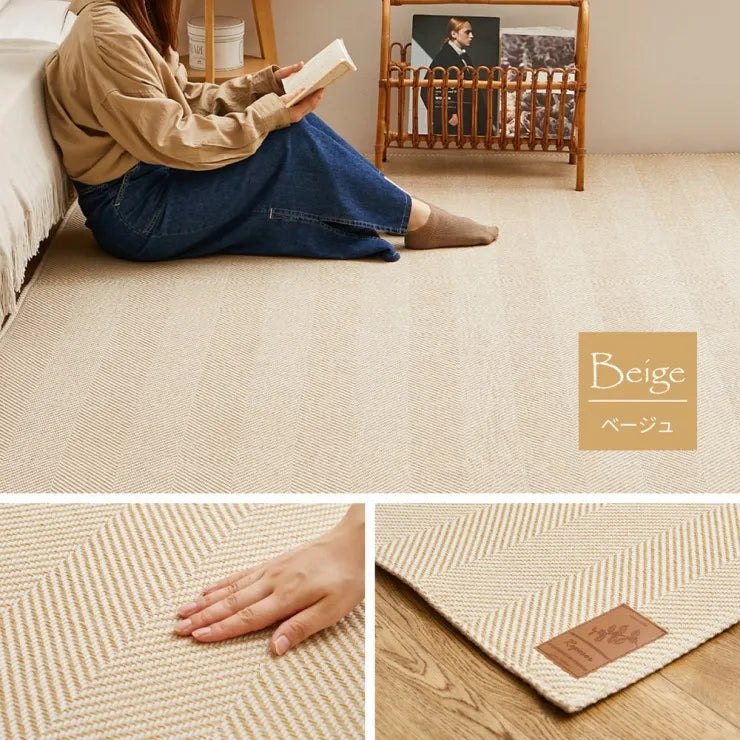 糸の組み合わせにこだわった、おしゃれなヘリンボンラグ。ざっくりとした織りで立体感があり、太めの間隔で仕上げたヘリンボン柄は、遠目で見るとボーダー柄のようにも見えるデザインに。ウレタン入りでほんのりふっくら、さらっとした肌ざわりで年中使いやすい素材感です。