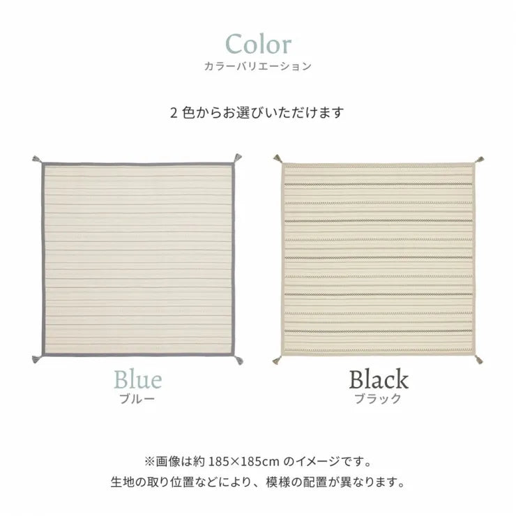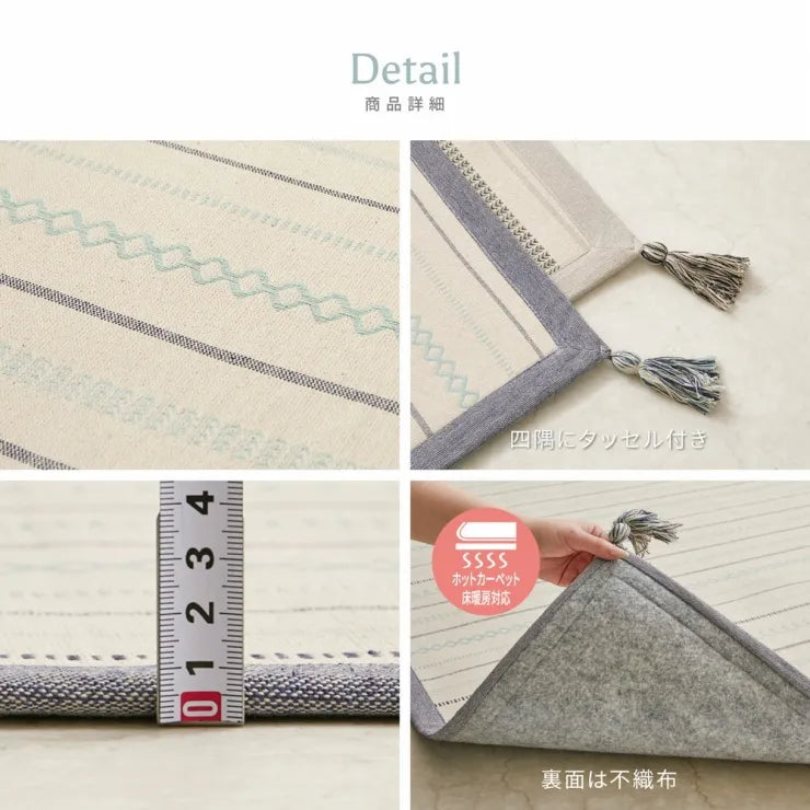 ふんわりとやわらかな肌ざわりと、インド綿ならではの素朴な仕上がりが魅力のラグ。四隅にはラグの色に合わせたタッセルが付いていて、おしゃれ度アップ!汚れても家庭用の洗濯機で洗えるため気軽にお洗濯でき、いつも清潔にお使いいただけます。小さなお子様やペットがいて、すぐ汚してしまいがちなご家庭にもおすすめ。やわらかくコンパクトに折りたためるから持ち運びや収納にも困りません。綿は吸湿性や通気性が高い素材で、夏の汗ばむ季節でもさらっと気持ちよく、また保温性も高いため寒い季節でもあたたかく、オールシーズン快適にお使いいただけます。