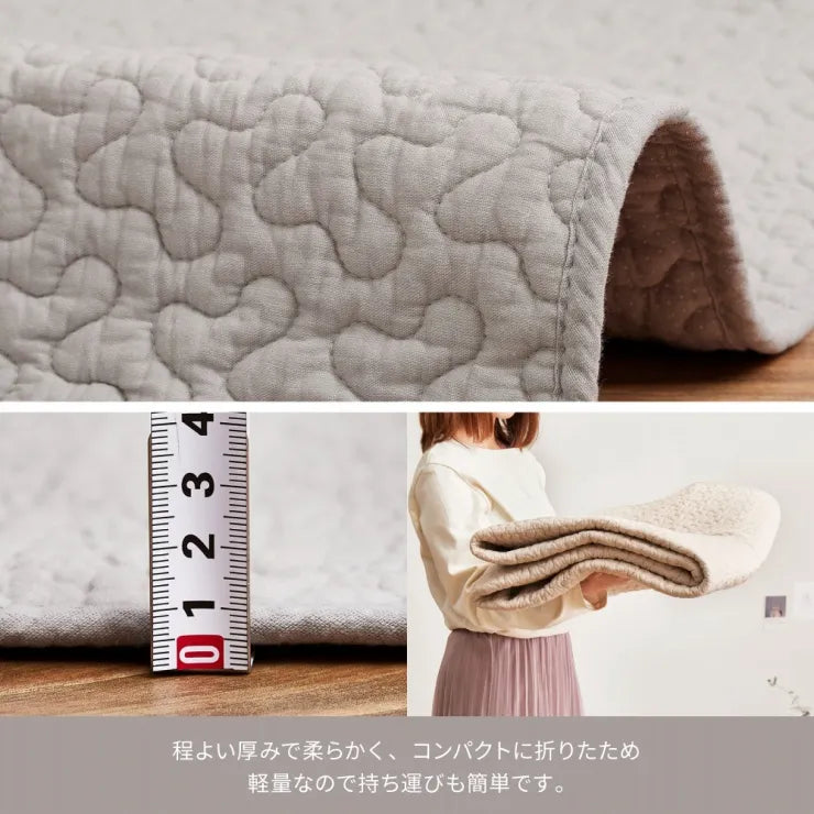 コットン100%で赤ちゃんの肌にもやさしく、中綿が入ったキルティング生地でふわっとやわらかな肌ざわり。